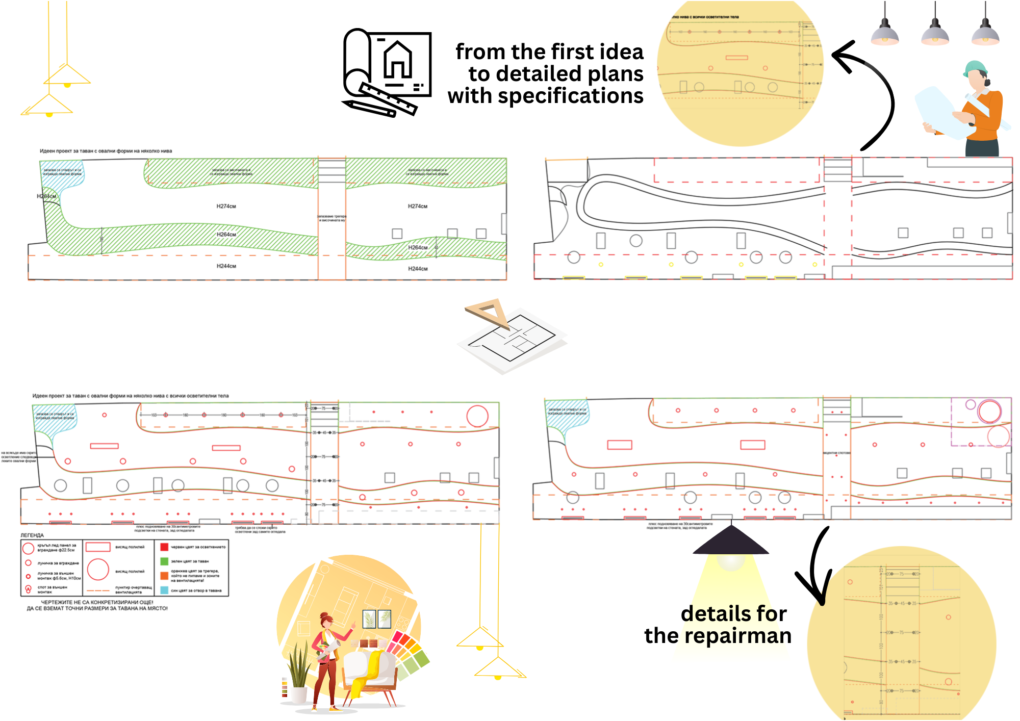 Ceiling & Lighting DWG Drawings – detailed technical drawings illustrating the custom ceiling design and integrated lighting solutions, ensuring clarity for execution.